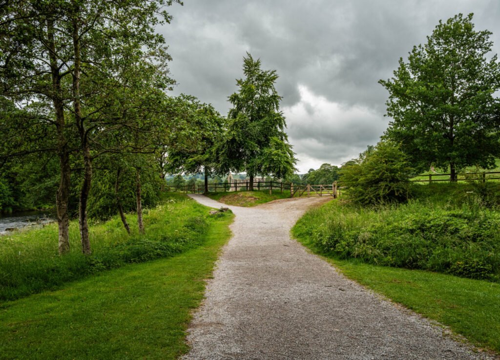 Following the river having crossed the bridge, you can’t help but come across this great little crossways of the paths with the abbey nestling in the trees in the distance.